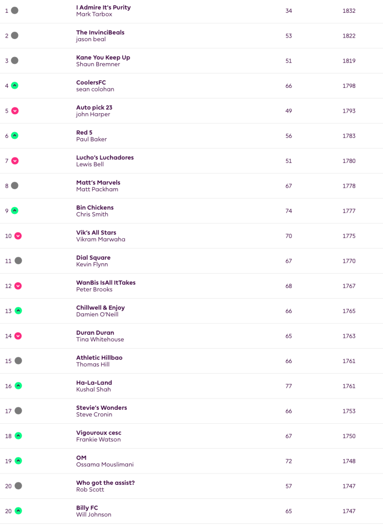 FFUK league – Even with his terrible game week, Mark Tarbox is still holding on to top place. However, anything can happen, especially as many chips are still to be played and as we know, timing is everything.