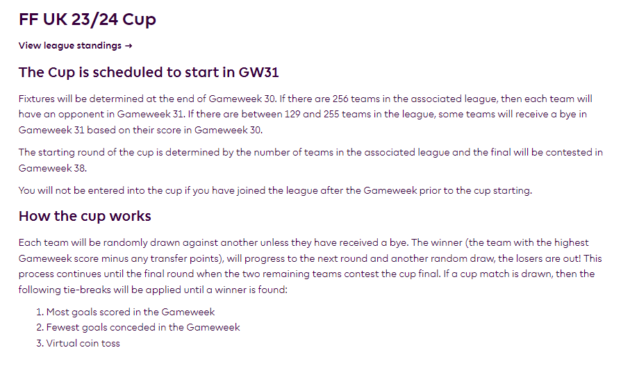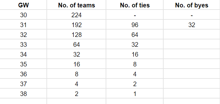 - GW30: Qualification – The best 32 scorers will get a bye into the 2nd round of the cup.