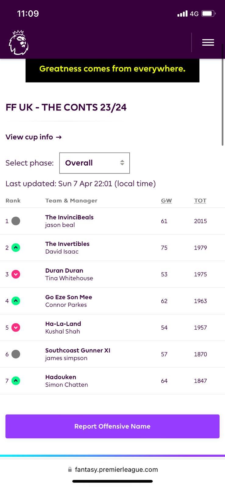 With the final countdown truly underway, the Conts has no mercy, and this week it was Tina Whitehouse who was left in last place by a single point from Kushal Shah, who spent the 2nd weekend in a row giving me a point by point update on how he was about to be Conted out! (Did you know Bealer was 100% out until Porro scored, no? Well I did!🙈)
