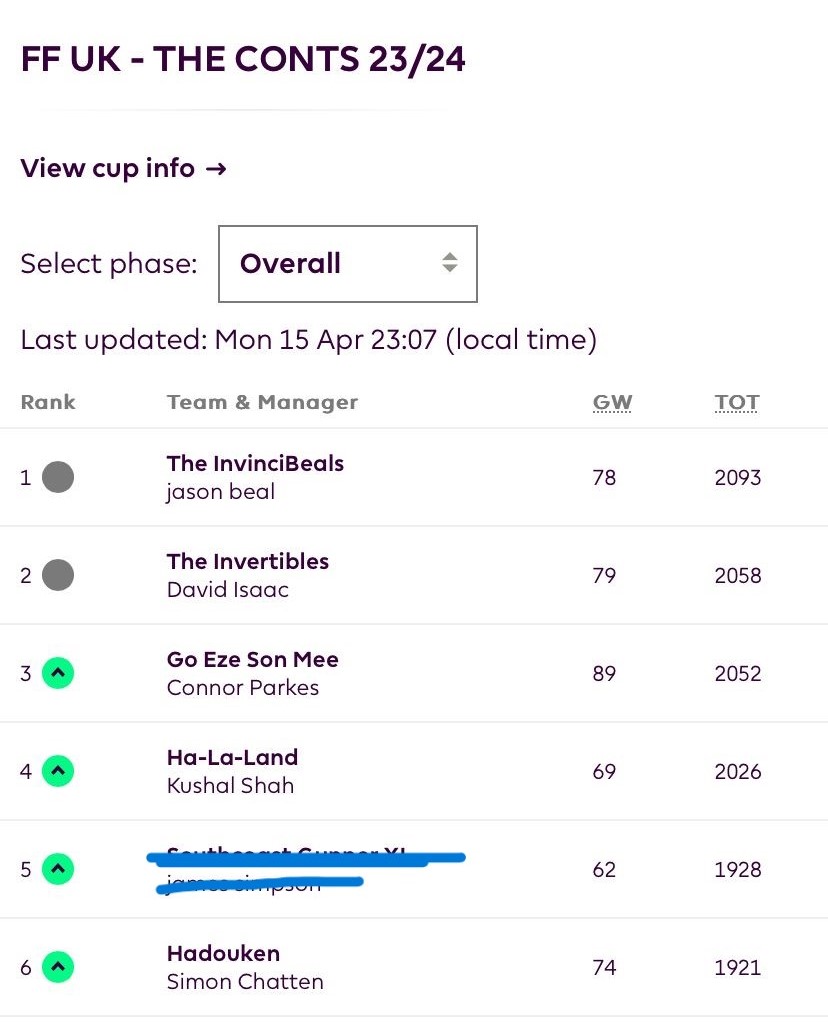 Last but not least we end with the Conts. Who is getting a horses head in their bed? Who is getting disappeared? That ‘honour’ falls to James Simpson this week who closed out the GW on an above average 62 but not enough to stay in the most unforgiving of leagues! Just 5 remain…
